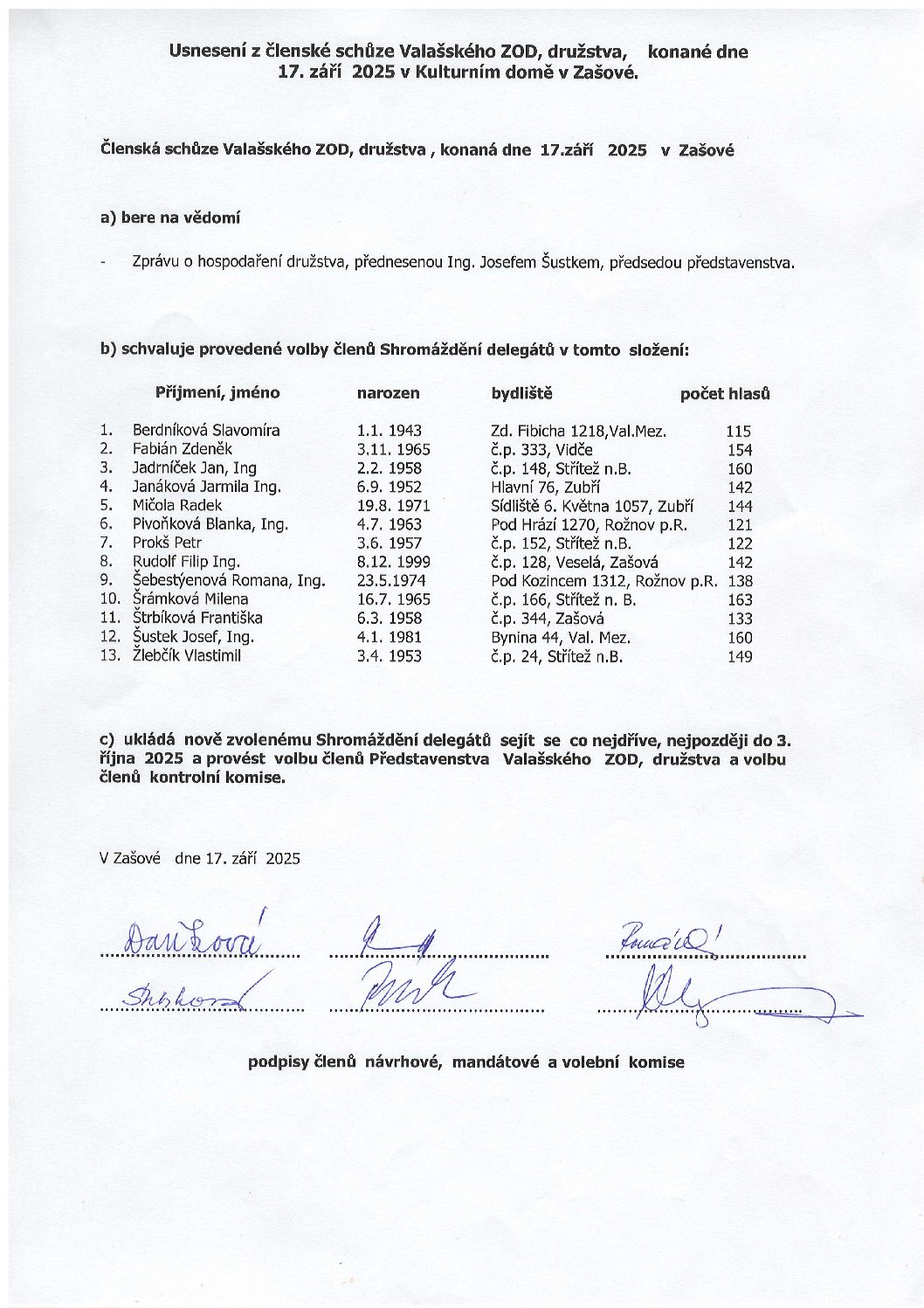Usnesení z Členské schůze konané dne 17. září 2025 v Kulturním domě v Zašové